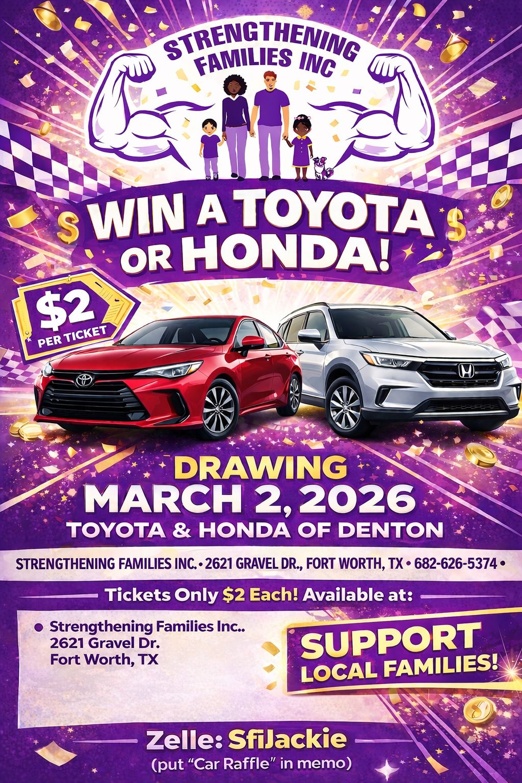 Supporting Strengthening Families Inc. Strengthening Families Inc. is excited to announce our Community Car Raffle Giveaway! One lucky supporter will win a Toyota or Honda vehicle, and every ticket purchased helps us continue serving families across the Dallas–Fort Worth community. When you purchase a ticket, you are helping us provide: • Food and essentials for families in need • Youth development and mentoring • Housing stability support • School supplies and holiday assistance • Community outreach programs Your support changes lives — and could put you in the driver’s seat of a new vehicle. ⸻ 🎟 Raffle Details Ticket Price: $2 per ticket Drawing Date: March 2, 2026 Drawing Location: Toyota and Honda of Denton Who Can Enter: Must be 18 years or older Need not be present to win (edit if needed) Tickets may be purchased: • In person at Strengthening Families Inc. • From authorized volunteers • Via Zelle: SfiJackie (memo: Car Raffle)